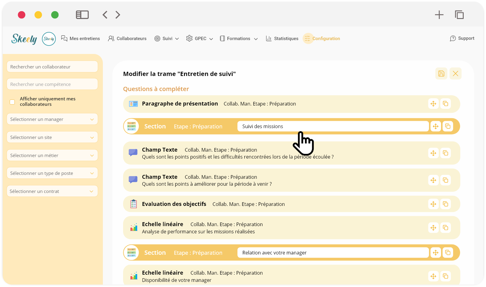 De la conception d’une trame au suivi des campagnes, Skeely gère l’ensemble des campagnes d’entretien d’évaluation.