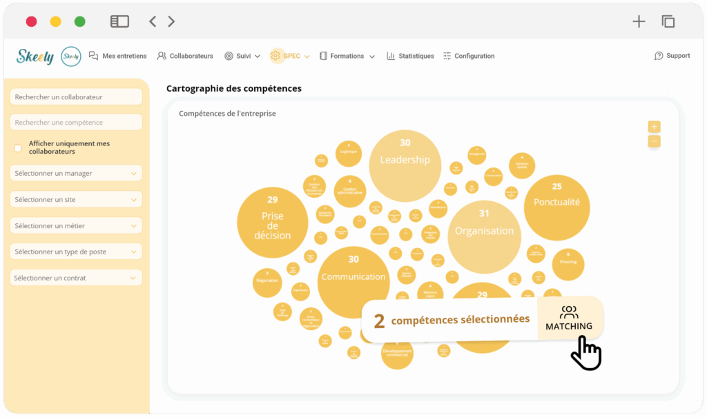 Les entretiens (professionnels, évaluations) enregistrés dans l’outil permettent d’intégrer les axes de développement compétences dans le dialogue entre collaborateur et manager. Les écarts identifiés deviennent des objectifs à faire évoluer.