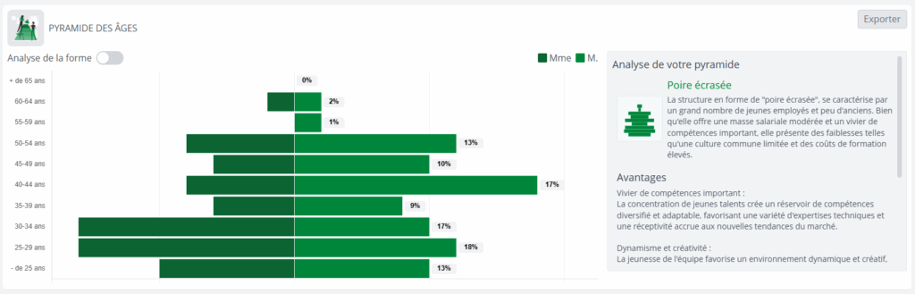 Pyramide des âges : La pyramide des âges est un outil démographique qui aide à visualiser la répartition des employés par âge au sein de l’entreprise. Elle permet d’anticiper les départs potentiels liés aux retraites et de planifier la succession, mais aussi de détecter des déséquilibres qui pourraient indiquer des difficultés à attirer ou retenir certaines tranches d’âge. En comprenant ces dynamiques, l’organisation peut ajuster sa politique RH pour favoriser un équilibre intergénérationnel et une meilleure rétention des talents.