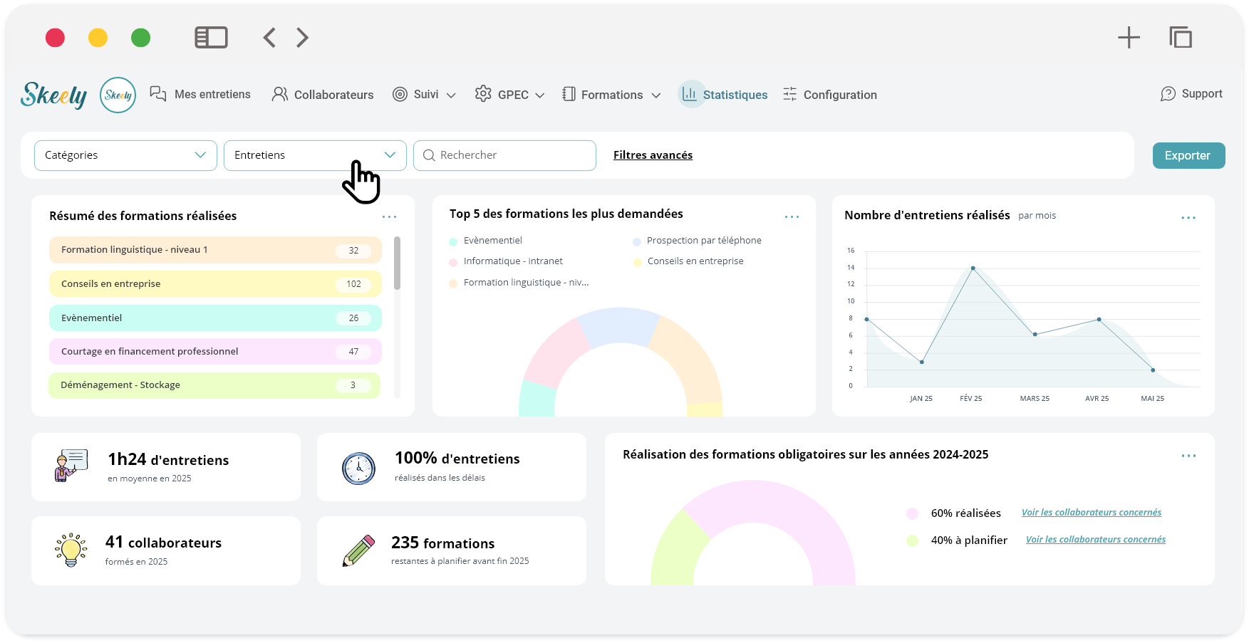 Oui ! Skeely vous donne la possibilité de modifier et de créer les statistiques que vous souhaitez en fonction des données que vous récupérez lors de vos entretiens d’évaluation.